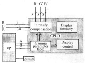 為了補(bǔ)償LED 因溫度引起的亮度變化,LED 顯示系統(tǒng)增加了亮度檢測(cè)電路。實(shí)驗(yàn)發(fā)現(xiàn),以20 ℃溫度間隔對(duì)色彩進(jìn)行溫度補(bǔ)償時(shí),能基本上滿足圖像的觀看質(zhì)量。為此,系統(tǒng)以常溫為基礎(chǔ),每隔20 ℃給出相應(yīng)基色的Gamma 校正參數(shù)。對(duì)于- 20 ℃~ + 80 ℃范圍,每個(gè)基色給出供5 種不同的Gamma 參數(shù)以補(bǔ)償亮度的變化。圖6 給出系統(tǒng)的溫度檢測(cè)電路和相應(yīng)的控制Gamma 參數(shù)的電路框圖。利用溫度傳感器DS18B20檢測(cè)環(huán)境溫度的變化,當(dāng)環(huán)境溫度到達(dá)設(shè)定溫度值時(shí),通過(guò)微處理器的ARC 3 個(gè)I/ O 線輸出5 個(gè)溫度狀態(tài)中的某一狀態(tài)值給CPLD。在CPLD 內(nèi)部設(shè)有RGB 三基色(3 ×4 + 1 = 13)13 個(gè)(常溫時(shí)采用一個(gè)標(biāo)準(zhǔn)的Gamma 參數(shù)校正,在其他溫度下,每個(gè)基色一個(gè)校正參數(shù)) Gamma 值的參數(shù)表,從表查出分別對(duì)應(yīng)RGB 的3 個(gè)Gamma 值提供給亮度控制電路和顯示控制電路。