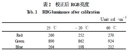 表1 中,常溫的白場(chǎng)配色比例為1. 92 ∶6. 57 ∶1. 51。而當(dāng)溫度發(fā)生變化時(shí),由于LED 的特性,使RGB 的亮度特性發(fā)生了嚴(yán)重的偏移,使白場(chǎng)的比例已完全偏離了常溫下的比例,使圖像在色彩發(fā)生了畸變。而采用本文的校正技術(shù)后,結(jié)果如表2 所示。