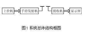 整個系統(tǒng)由三個相對獨立的子系統(tǒng)組成,即上位機、手持發(fā)射機、接收機和顯示屏系統(tǒng)。其結(jié)構(gòu)框圖如圖1所示。