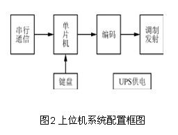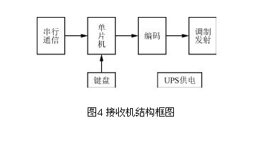 發(fā)射機由單片機、鍵盤、編碼器、發(fā)射器、串行通信接口和UPS供電系統(tǒng)組成,其結(jié)構(gòu)框圖如圖3所示。