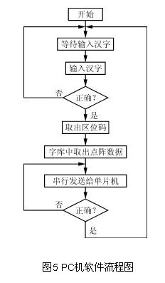 設(shè)終端顯示屏所顯示的是16×16的漢字點陣。所以,要想在終端上顯示廣告信息,必須將該信息所包含的漢字的點陣數(shù)據(jù)傳到終端上。在TURBOC3.0中,將漢字賦值給一個變量時,實際上是將該漢字的區(qū)位碼賦值給這個變量。每個漢字都是16×16的點陣,筆劃經(jīng)過的地方為“1”,其余為“0”。這樣,按從上到下,從左到右的順序,一個漢字由256個點組成,也就是32 個字節(jié)。漢字按區(qū)位碼的順序排列在漢字字庫中,區(qū)碼為行,位碼為列,一區(qū)有94位。這樣,某漢字在漢字庫中的偏移地址為(區(qū)碼×94+位碼)×32.取出后的32字節(jié)漢字點陣,經(jīng)由PC機的串行口送入到發(fā)射機中。其流程如圖5所示。