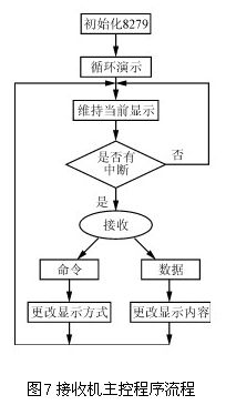 該部分軟件的功能是完成對接收數(shù)據(jù)的識別、存儲、變換和顯示驅(qū)動,并可實現(xiàn)本地本機的自檢,顯示固化圖像。當接收裝置的譯碼芯片有輸出時,單片機就中斷當前的顯示,接收標志字,然后判斷此標志字的內(nèi)容,確定將接收的是圖像點陣,還是操作控制命令。若是點陣數(shù)據(jù),就將其連續(xù)接收存放到一個顯示緩沖數(shù)據(jù)庫中,按當前的方式顯示。若是命令,則立刻改變顯示方式。