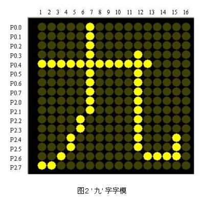 本設(shè)計(jì)的點(diǎn)陣顯示屏電路是以AT89S52 單片機(jī)作主控器,結(jié)合74LS154 和74LS595 進(jìn)行擴(kuò)展。選擇了共陰的行列掃描方式,單片機(jī)P0,P2 口輸出的高電平對(duì)應(yīng)字模的亮點(diǎn),低電平對(duì)應(yīng)字模的暗點(diǎn),以九字為例,如圖2 所示。