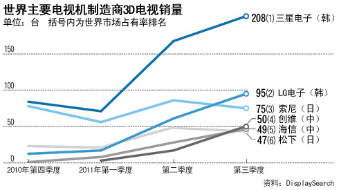 據(jù)市場調(diào)查機構(gòu)Display Search 20日公布的《第三季度世界3D電視銷量》顯示,中國有4家企業(yè)進入前十,分別是創(chuàng)維(50萬臺,第4位)、海信(49萬臺,第5位)、長虹(34萬臺,第7位)、康佳(27萬臺,第9位)。