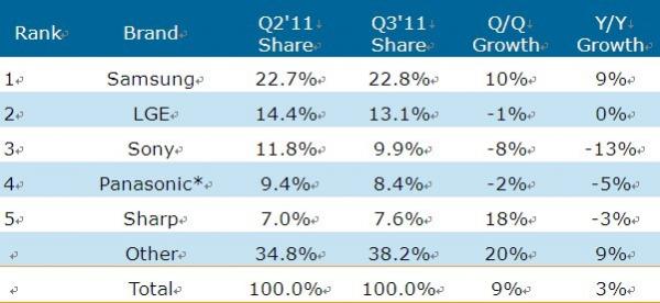 2011年第三季三星全球平板電視營收占比微幅提高,為22.8%,遠(yuǎn)遠(yuǎn)領(lǐng)先第二大品牌商樂金電子。就營收而言,除了在日本沒有出售電視,三星在全球其他各個地區(qū)營收第一,在亞太地區(qū)和拉美地區(qū)領(lǐng)先于樂金電子。三星液晶電視和等離子電視營收居于首位,CRT電視居第二位,并是五大品牌商中唯一一家營收同比成長的品牌商。