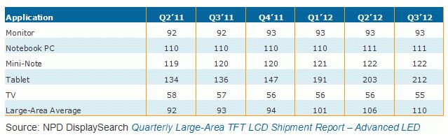 NPD DisplaySearch最新季度大尺寸TFT-LCD面板出貨調(diào)查指出兩個趨勢,一是平板電腦用面板持續(xù)往更高分辨率方向發(fā)展,二是低成本直下式LED背光面板將逐漸成為TFT-LCD電視面板另一主流。