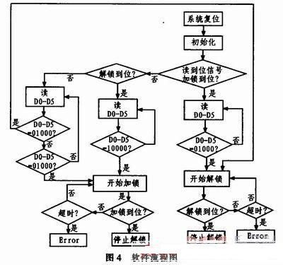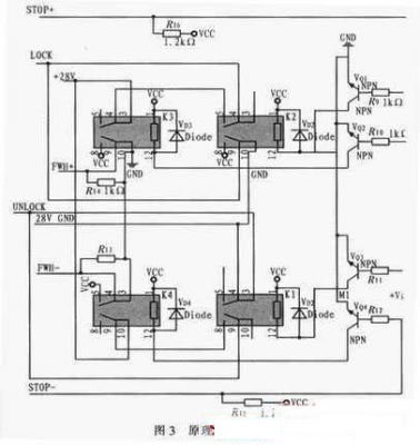 當(dāng)信號(hào)D0-D5為10000時(shí),單片機(jī)通過(guò)P10口對(duì)方位鎖定機(jī)構(gòu)發(fā)出加鎖命令,控制命令經(jīng)SN54LS245驅(qū)動(dòng)后作用于R9和VQ1,VQ1導(dǎo)通后,繼電器K2的4、5導(dǎo)通,輸出+28 VLOCK信號(hào)控制電機(jī)進(jìn)行加鎖。完全鎖定后,光電開(kāi)關(guān)輸出(上)信號(hào)輸出高電平即圖3中STOP+,STOP+通過(guò)上拉電阻R16作用于R10和VQ2,VQ2導(dǎo)通后,繼電器K3的4、5和8、9導(dǎo)通,+28 V LOCK信號(hào)切斷,硬件上先停止加鎖控制,防止造成機(jī)構(gòu)硬件損傷。而K3的8、9導(dǎo)通后,F(xiàn)WH+輸出+5 V電平給單片機(jī),單片機(jī)接收信號(hào)后,終止加鎖命令,VQ1截止,K3恢復(fù)常態(tài)。解鎖過(guò)程和加鎖過(guò)程類似,在此不作贅述。