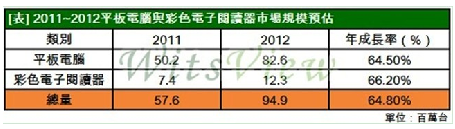 整體而言, WitsView 認(rèn)為 2012年平板電腦的發(fā)展基調(diào)將偏向樂(lè)觀,預(yù)估平板電腦本身的需求達(dá)8,260萬(wàn)臺(tái),彩色電子閱讀器方面則為1,230萬(wàn)臺(tái),兩者合計(jì)的市場(chǎng)規(guī)模將從今年的5,760萬(wàn)臺(tái)攀升至9,490萬(wàn)臺(tái),年成長(zhǎng)率高達(dá)65%。