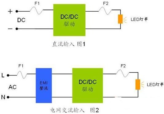 面對(duì)LED照明的眾多應(yīng)用領(lǐng)域,由于市場(chǎng)并沒(méi)有形成統(tǒng)一的規(guī)范,存在多種多樣的驅(qū)動(dòng)解決方案,但是萬(wàn)變不離其中,從過(guò)流保護(hù)的角度來(lái)看大體上根據(jù)燈體的輸入電流來(lái)可以分為:直流輸入和電網(wǎng)交流輸入兩種最基本的類(lèi)型,兩種類(lèi)型的主要區(qū)別在于驅(qū)動(dòng)電源是否有交流轉(zhuǎn)直流的模塊。當(dāng)然市場(chǎng)上也有很多電阻、阻容降壓等低成本解決方案,沒(méi)有EMI整流和恒流驅(qū)動(dòng)的模塊,但是由于初級(jí)端保險(xiǎn)絲的選用要求與圖2是一致,在此歸入第二種類(lèi)型。