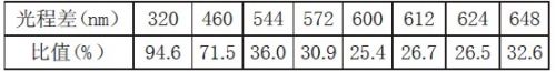 由圖1 可總結(jié)出,在有效光程差較小時,可見光的各波長比較聚集,顏色只有黑白兩色。在有效光程差300nm 附近出現(xiàn)一亮態(tài)極大值,之后隨著有效光程差的增大,不同波長的相位差差別越大,其亮態(tài)峰值將越來越小。