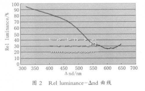 采用本試驗總結(jié)出的以上Rel luminance- Δnd曲線,對于某一未知光程差的VA 液晶顯示器,只需簡單測試出高壓光電曲線,得出高壓顯示亮度與最大值顯示亮度的比值,然后對照圖2 所示的曲線,就可準(zhǔn)確得出相應(yīng)的光程差值。