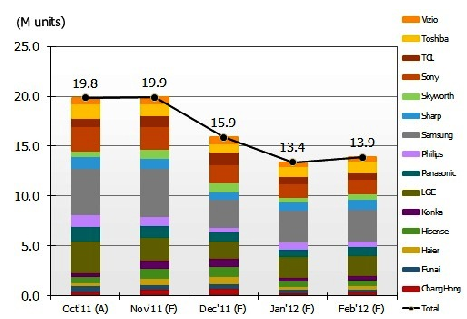 NPD DisplaySearch認為,盡管北美和中國大陸的銷售實績強勁,液晶電視品牌商仍謹慎管控庫存。從12月到 2012年2月,液晶電視品牌計劃降低生產(chǎn)數(shù)量以預(yù)防在傳統(tǒng)的第一季淡季堆積過多的庫存。在全球液晶電視品牌生產(chǎn)計劃調(diào)查中顯示, 2012年1月的整機生產(chǎn)量將降到1,340萬臺的數(shù)量,而液晶電視面板業(yè)者則將需在未來的幾個月持續(xù)控制產(chǎn)能利用率,即使面板價格轉(zhuǎn)為穩(wěn)定。