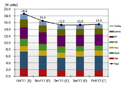 可攜式個人電腦品牌各月出貨預(yù)測數(shù)量 (單位:百萬臺)