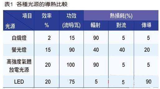 在此情況下,約20%輸入功率轉(zhuǎn)換為光,80%則轉(zhuǎn)換為熱。這取決于多種因素,發(fā)熱可能與底層不規(guī)則以及聲子發(fā)射、密封、材料等有關(guān)。在LED產(chǎn)生的總熱量中,有90%透過傳導(dǎo)傳輸。表1為耗散來自LED接面的熱量,傳導(dǎo)是導(dǎo)熱的主要通道,因為對流和輻射僅占全部熱傳輸約10%。比如一個LED可能轉(zhuǎn)換近10.72瓦熱量(13.4瓦×0.8)。其中,9.648瓦(10.72瓦×0.9)透過傳導(dǎo)從LED接面?zhèn)鬏敾蜻w移。顯然,LED光源需要精確的功率和熱管理系統(tǒng),因為與其他光源相比,提供給LED的電能大部分轉(zhuǎn)換為熱量。如果沒有適當(dāng)?shù)臒峁芾?,這種熱量會影響LED壽命和色彩輸出。同時由于LED驅(qū)動裝置屬于硅組件,很快就會失效,因此必須配備故障安全備用過電流保護(hù)裝置。