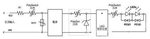 驅(qū)動輸出上的PolySwitch組件有助于防止因有害短路或其他負(fù)載異常而受損,為了充分發(fā)揮PolySwitch組件的作用,可以與金屬芯電路板或LED散熱片熱接,此外,與LED并置的PESD組件也可以對靜電放電加以保護(hù)。