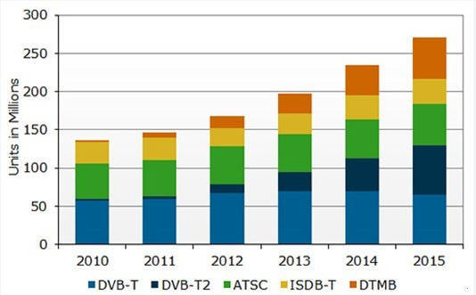 “到2015年,DVB-T和DVB-T2電視的出貨量將處于相當(dāng)水平,”Gray繼續(xù)說到,“俄羅斯和印度政府轉(zhuǎn)向T2的決定給行業(yè)注入強心劑,并將推動成本下降,促進新一輪電視應(yīng)用。”
