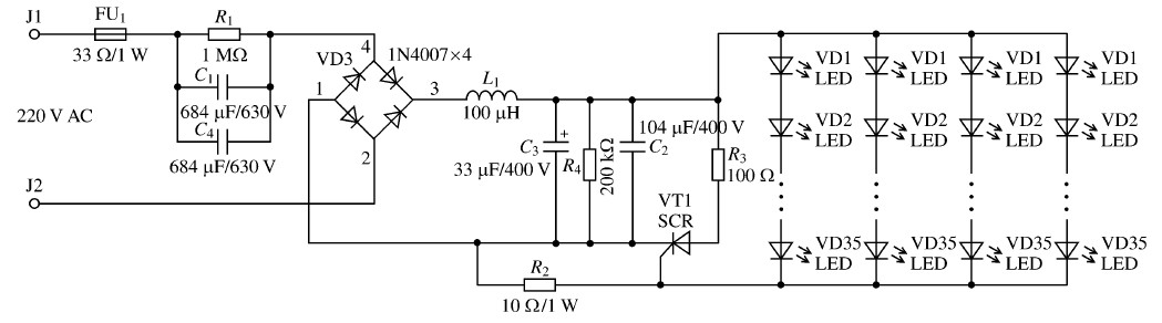 該電路共驅(qū)動(dòng)140只白光LED (小功率) ,采用35串4并的模式,采用電容降壓式驅(qū)動(dòng)方式。其中, C1、C4 為并聯(lián)的兩個(gè)相同的電容,起降壓及限流作用; 4個(gè)1N4007組成的整流橋?qū)斎虢涣麟妷哼M(jìn)行整流;濾波電容C3 用于濾除整流輸出電壓中的交流成分,使電壓更為平滑; L1、C2 用于濾除輸出電壓中的高頻成分;電阻R4 為C3 提供放電回路;采用單向晶閘管SCR729210對(duì)電路進(jìn)行保護(hù), R3 為限流電阻。