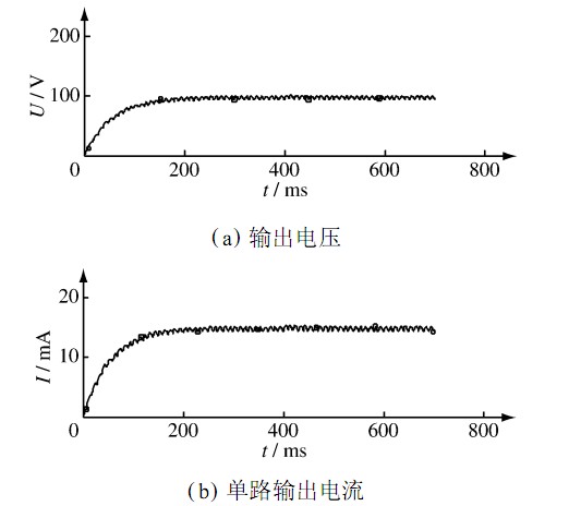 為理論上驗(yàn)證設(shè)計(jì)的可行性,采用PSp ice軟件對(duì)電路進(jìn)行了仿真分析。結(jié)果如圖2所示。電路在210 ms時(shí)進(jìn)入穩(wěn)定狀態(tài),穩(wěn)定后其輸出電壓為97 ±2. 2 V,輸出電流為14. 7 ±0. 3 mA,基本驗(yàn)證了電路設(shè)計(jì)的可行性。LED 日光燈電路輸出特性如圖2所示。