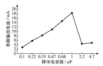 圖4 實(shí)測(cè)輸出電流與降壓電容的關(guān)系