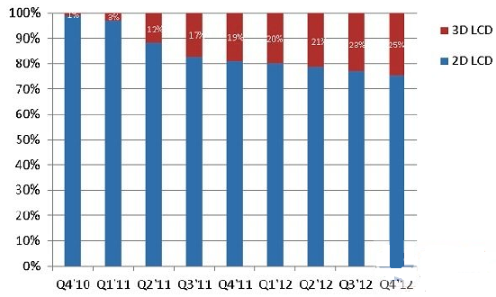 根據(jù)NPD DisplaySearch的調查,在元旦期間的主要城市賣場,3D液晶電視在零售終端滲透率甚至高達40%;而整體3D液晶電視出貨滲透率可望在2012年第一季超過20%;該機構在全球電視出貨與預測季報(Quarterly Advanced Global TV Shipment and Forecast Report)中預測,到2012年第四季,中國大陸 3D液晶電視滲透率可達25%。