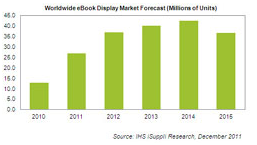 電子書閱讀器顯示器市場(chǎng)將面臨成長(zhǎng)瓶頸。即使2011年整體出貨量成長(zhǎng)逾倍,但市場(chǎng)研究機(jī)構(gòu)IHS iSuppli預(yù)估,未來3年,電子書閱讀器顯示器的成長(zhǎng)將逐漸放緩,甚至于2015年首度出現(xiàn)負(fù)成長(zhǎng)。