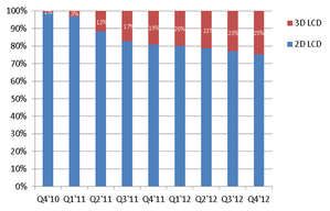 過去一年,雖然國際市場需求下降,但是中國彩電市場仍保持穩(wěn)定成長。而2012年中國3D頻道的開播,不僅將3D電視熱潮推到更高,也成為拉動(dòng)彩電銷售增長的一個(gè)新亮點(diǎn)。根據(jù)NPD DisplaySearch報(bào)告指出,2012年第四季中國3D電視滲透率可達(dá)25%。