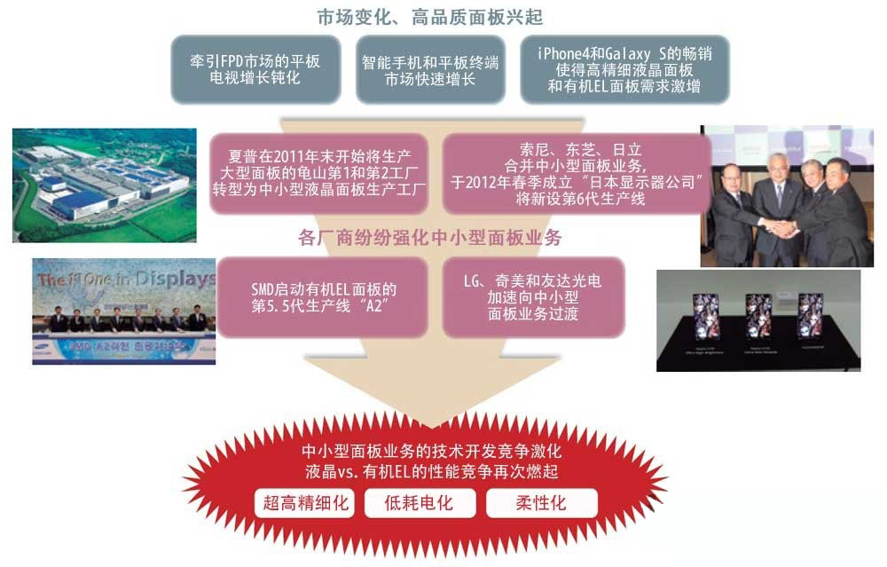 日韓臺(tái)的面板廠商開(kāi)始將業(yè)務(wù)重心從電視機(jī)用大型面板轉(zhuǎn)向智能手機(jī)和平板終端使用的中小型面板。今后,技術(shù)開(kāi)發(fā)競(jìng)爭(zhēng)將越來(lái)越激烈。