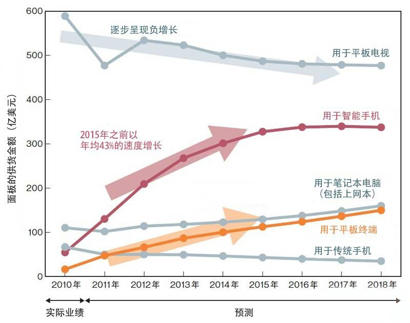 主要消費(fèi)類(lèi)產(chǎn)品配備的面板供貨金額預(yù)測(cè)。預(yù)計(jì)智能手機(jī)和平板終端使用的中小型面板將大幅增長(zhǎng),而電視機(jī)用大型面板將呈現(xiàn)緩慢的負(fù)增長(zhǎng)。(根據(jù)DisplaySearch的資料制作)