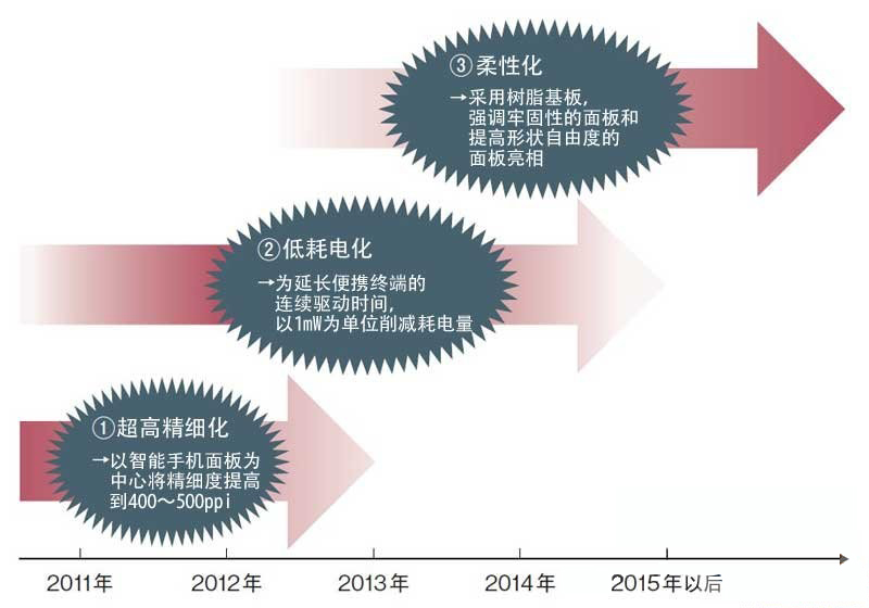 ①超高精度化的目標(biāo)是,能在智能手機(jī)面板上顯示1920×1080像素的全高清影像。為此,需要將分辨率由目前的330ppi提高至400~500ppi。②低耗電量化方面,為延長(zhǎng)便攜終端的連續(xù)驅(qū)動(dòng)時(shí)間,需要以1mW為單位不斷削減耗電量。③柔性化方面,為實(shí)現(xiàn)具有高堅(jiān)固性和高形狀自由度的面板,需要采用樹(shù)脂基板。