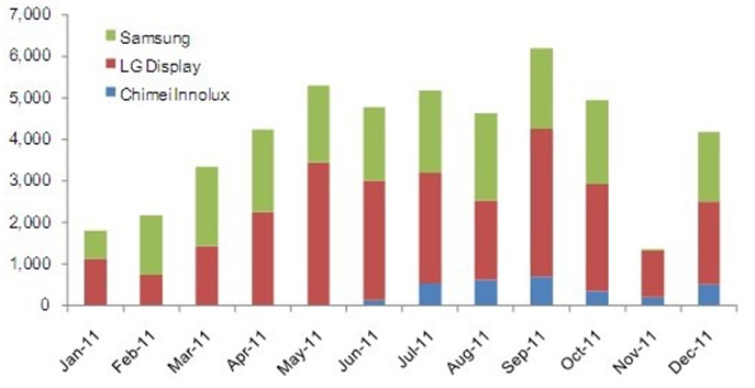 2011年9.7" iPad平板電腦面板出貨達(dá)到了4千8百萬(wàn)片。雖然面板廠商之前的出貨預(yù)期更高,但受到了第四季度庫(kù)存調(diào)整的影響而最終無(wú)法達(dá)到2011年全年5千萬(wàn)片以上的目標(biāo)。2011年的9.7寸面板出貨以XGA(1024x768)規(guī)格為主,亮度要求為400nits以上;且采用了IPS或FFS規(guī)格的廣視角技術(shù),而主要的面板供貨商為韓國(guó)的三星、LG Display與臺(tái)灣的奇美。根據(jù)NPD DisplaySearch每月TFT LCD面板出貨報(bào)告(Monthly TFT LCD Shipment Database),三家9.7寸面板供貨商在2011年的出貨各有千秋,如下圖所示。