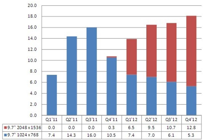 NPD DisplaySearch 指出,展望2012年,9.7寸iPad 面板出貨預(yù)計(jì)將可達(dá)6千5百萬(wàn)片以上,主要驅(qū)動(dòng)力來(lái)自于新的iPad機(jī)種的推出、既有iPad面板的成本再降低、面板分辨率的再提升以及新面板技術(shù)(例如薄化玻璃、透明金屬氧化物晶體管TFT LCD等等)的采用。