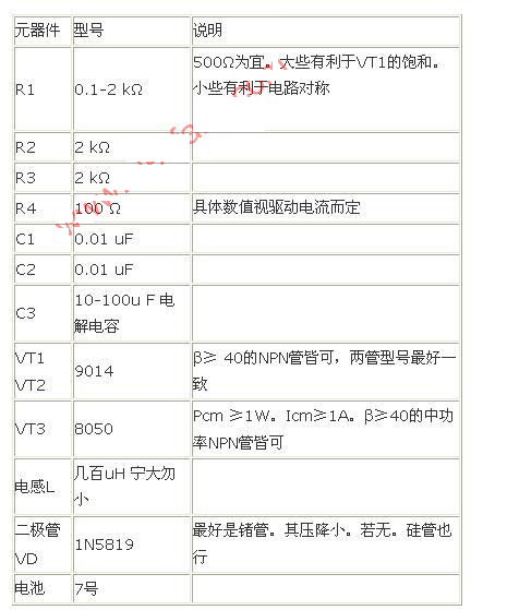 現(xiàn)進(jìn)行估算。驅(qū)動(dòng)一個(gè)LED約要100mW。電源的Po約為20mW。為了保證供給,按P=100mW計(jì)算。取η=80%,再隨便找一個(gè)幾百uH的電感,如500 uH:另一方面,根據(jù)能量守恒。3.3V約為1.2V的3倍。再由于效率問題。電感的驅(qū)動(dòng)電流差不多要LED工作電流的3-4倍,就取為120mA,這樣一來。便可算出振蕩頻率為34kHz左右,這樣,取R=2kΩ,C=0.01 uF便能達(dá)到要求。確定參數(shù)時(shí)。頻率可高不可低,電感寧大勿小,這樣才能保證輸出功率足夠大,才能有足夠的調(diào)節(jié)空間。