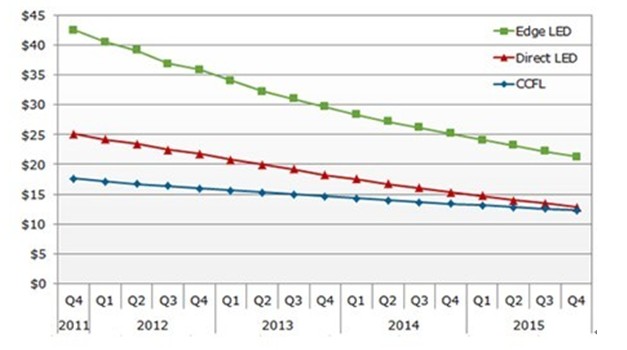 根據NPD DisplaySearch資深總監(jiān)Yoshio Tamura指出,LED背光面板在液晶電視滲透率較去年預期低了7%,主要是受到LED價差的影響。據調查,2011年第四季32寸電視面板中,LED背光源模塊的價格比CCFL高42%,但我們原本預期應是低27%。因此,電視廠商轉而改變原本直下式LED背光源液晶電視上的策略。與其顧及高畫質,電視廠商轉而選擇種相對低功耗但成本較低的新型LED液晶電視作為銷售特點,同時將增加與CCFL背光液晶電視,甚至傳統(tǒng)CRT映像管電視的競爭力。