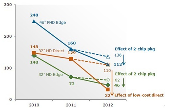 2010-2012電視中使用LED封裝顆數的變化