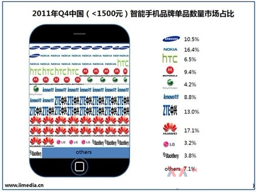 在智能手機市場品牌占有率狀況方面,艾媒咨詢數(shù)據(jù)顯示,2011年第四季度中國智能手機市場諾基亞、三星、蘋果分別占有32.9%、17.3%、11.7%。艾媒分析認為,雖然諾基亞智能手機憑借其良好的壽命,仍占市場1/3強,但是諾基亞的市場份額正在持續(xù)萎縮;而三星、蘋果等海外品牌發(fā)展迅猛;華為為首等一批國產(chǎn)手機品牌通過和運營商合作推出“千元智能手機”而逐漸擴大市場份額。