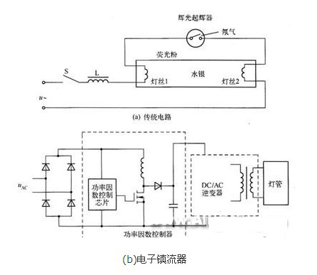 - 采用一個(gè)串聯(lián)的鐵芯電感和一個(gè)并聯(lián)的起輝器