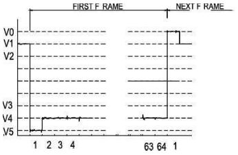 以輸出B形波的芯片的COM線為例。在沒有加電容之前選擇點(diǎn)和半選點(diǎn)的電壓波形都有畸變,畸變嚴(yán)重時(shí)會(huì)造成串?dāng)_影響顯示對(duì)比度,波形如圖2所示。增加電容后,波形會(huì)得到很大的改善,波形如圖3所示。