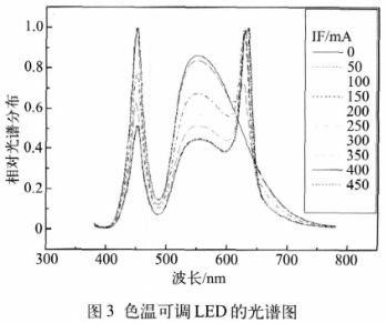 圖3為采用遠(yuǎn)方HASS-2000高精度快速光譜輻射計(jì)測量得到的色溫可調(diào)LED 的光譜圖,從圖中可以看出,隨著紅光LED 電流的變化(從0 到450mA),LED 的相對光譜也會隨之變化,LED 的光譜有三個(gè)峰值,分別在450nm、550nm和628nm,暖色溫的發(fā)光效率大于68lm/W,冷色溫的發(fā)光效率達(dá)到87lm/W。