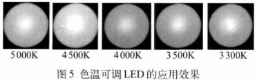 集成封裝的LED,由于工作電流較大,工作時(shí)產(chǎn)生大量的熱量,積聚在pn 結(jié)內(nèi)部的熱如不及時(shí)傳導(dǎo)出去,將導(dǎo)致器件溫度升高,溫度對LED的性能產(chǎn)生重要的影響,如色溫變化、波長紅移、正向壓降等。圖5 所示為色溫可調(diào)LED的應(yīng)用效果,將封裝好的色溫可調(diào)LED模塊安裝到100mm筒燈上,紅光LED加上不同的電流,得到筒燈的發(fā)光效果。筒燈連續(xù)點(diǎn)亮30min 后,測試筒燈上散熱器溫度為38℃,鋁基覆銅板上的溫度為38.5℃(室溫25.2℃),說明色溫可調(diào)LED 具有良好的散熱性能。