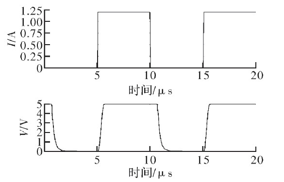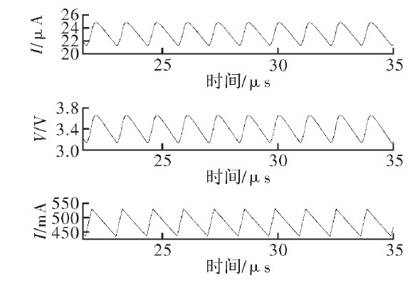 為驗(yàn)證文中提出的電流采樣電路的功能,結(jié)合滯環(huán)控制電路及外部負(fù)載在Cadence中進(jìn)行了仿真。圖5為輸入電壓20 V時采樣電流、電壓與負(fù)載電流的關(guān)系。由圖可見,采樣電流與采樣電壓隨負(fù)載電流同相周期性變化,周期約為1.2μs.