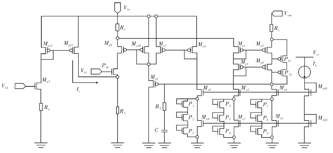 為使低壓管能在高壓輸入中也正常工作,電壓鏡采用了高低壓器件混用的共源共柵結(jié)構(gòu)。Mp1、Mp2、Mn1和Mn2為低壓管;Mp3、Mp4、Mn3和Mn4為高壓管。一方面,高壓管作為共源共柵器件增大了輸出電阻;另一方面,它承受了大部分壓降,以保護(hù)低壓管不被擊穿。不過,共源共柵結(jié)構(gòu)帶來另一個問題。串聯(lián)電阻R2令Mp2和Mp4之間的次極點(diǎn)更靠近原點(diǎn),使系統(tǒng)變得不穩(wěn)定。為消除該極點(diǎn)帶來的影響,在共源共柵結(jié)構(gòu)的輸出端加入補(bǔ)償電阻R5和電容C,引入一個零點(diǎn)并使主極點(diǎn)更低。