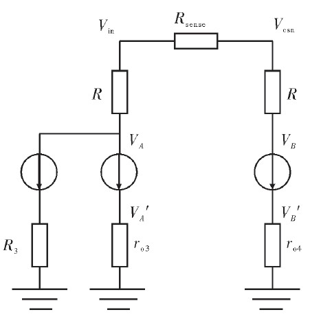 在實(shí)際電路中,VA對VB的匹配度直接影響采樣精度。圖3為簡化的小信號模型。圖4為實(shí)際電路圖。Vin與Vcsn為精確采樣電阻Rcsn兩端電壓,輸入范圍8~40 V;Vcc為芯片內(nèi)部5 V穩(wěn)定電源。
