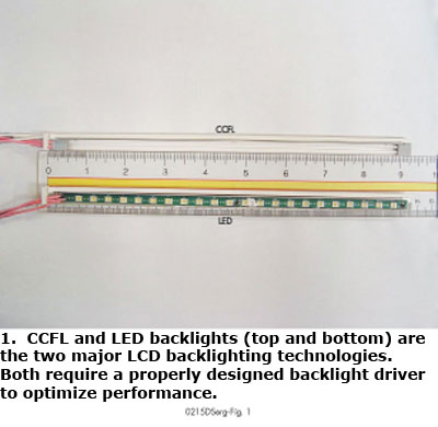 典型的LCD背光可以是1個或多個冷陰極熒光燈(CCFL),或是一組發(fā)光二極管(LED)陣列。圖1分別給出了采用這兩種技術(shù)的一個例子。背光圖像的質(zhì)量在很大程度上取決于背光驅(qū)動器。在本文中,我們將討論有助于CCFL和LED發(fā)展的一些注意事項(xiàng),以及如何為這兩種背光供電。