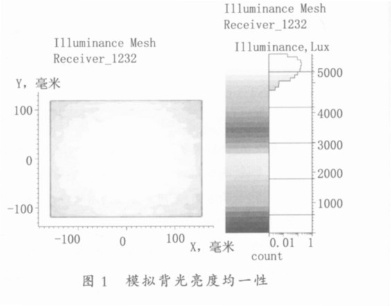 采用STAMPER 技術(shù),一體成型射出導(dǎo)光板,減少印刷環(huán)節(jié),較少印刷污染。以模具射出形成網(wǎng)點(diǎn),入射面設(shè)計(jì)能破壞光源的全反射,并控制光源射出導(dǎo)光板面角度的分布,網(wǎng)點(diǎn)數(shù)量的多少對(duì)光源做有效的控制。網(wǎng)點(diǎn)可隨模具任意設(shè)計(jì)形狀,若網(wǎng)點(diǎn)為極小的平滑鏡面,可使光在網(wǎng)點(diǎn)及導(dǎo)光板內(nèi)部的損失減至最小,應(yīng)用光學(xué)設(shè)計(jì)軟件進(jìn)行網(wǎng)點(diǎn)設(shè)計(jì)。圖1 所示為模擬的背光組件的亮度均一性。