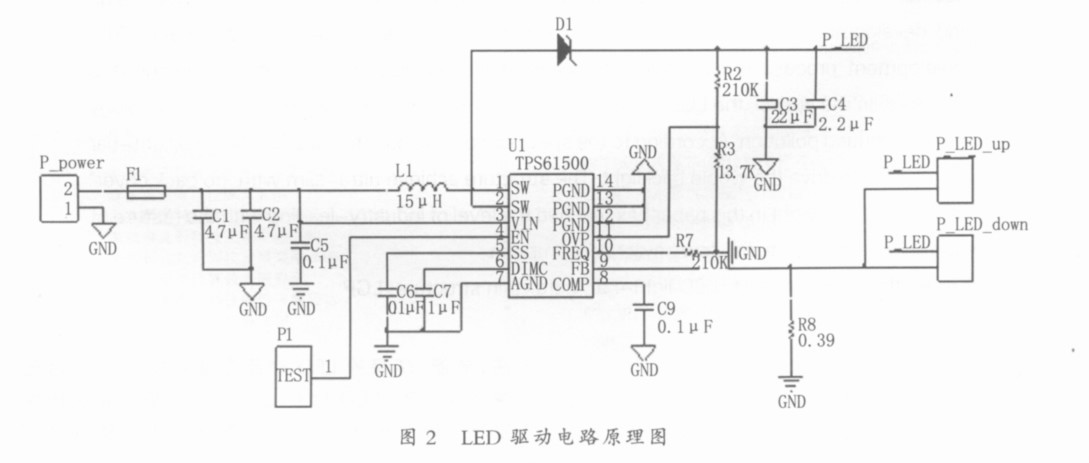 在側(cè)光式背光組件中, 應(yīng)用長(zhǎng)條式的LEDlight- bar 作為整個(gè)組件的光源,LED light- bar 采用白光頂發(fā)光LED.以某機(jī)種產(chǎn)品為例,單顆功耗:3.2V×0.02A=0.064W.整個(gè)light- bar 功耗:0.064W×42=2.69W.LED 背光源電路設(shè)計(jì)主要包括發(fā)光條設(shè)計(jì)和驅(qū)動(dòng)控制電路設(shè)計(jì),驅(qū)動(dòng)電路采用一款DC/DC 恒流驅(qū)動(dòng)芯片,對(duì)發(fā)光條進(jìn)行恒流驅(qū)動(dòng)。圖2 所示為L(zhǎng)ED light- bar 的驅(qū)動(dòng)原理圖。