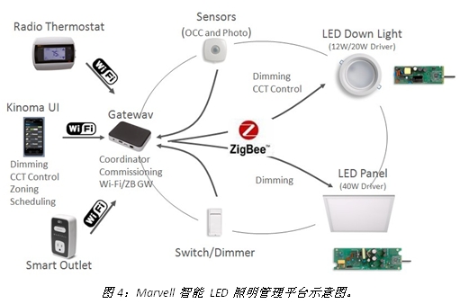 Marvell智能 LED照明管理平臺(tái)提供了完全集成的LED照明和無(wú)線控制系統(tǒng),因此不論是易用性的提升還是安裝成本的降低都趨向于極致,大大簡(jiǎn)化了使用和維護(hù)難度,使得非專業(yè)人員也能輕松應(yīng)對(duì)。該平臺(tái)的一大特色是允許終端用戶可以使用智能手機(jī)和平板電腦方案,使他們可以方便地從任何地方管理、分析并維護(hù)一個(gè)更具性價(jià)比的數(shù)字照明方案。