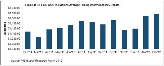 據(jù)IHS iSuppli公司的美國電視價(jià)格與規(guī)格追蹤報(bào)告,盡管有上年結(jié)轉(zhuǎn)的庫存,但由于這些庫存具備高端功能,2月份美國平板電視價(jià)格連續(xù)第三個(gè)月上漲。