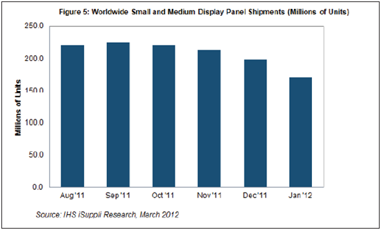 臺(tái)灣廠商的產(chǎn)能利用率從上一季度的62%降至58%,導(dǎo)致1月中小顯示器面板出貨量降至1.313億個(gè),比2011年12月減少2900萬(wàn)個(gè)。臺(tái)灣六家供應(yīng)商按出貨量降序排列:中華映管,奇美電子,瀚宇彩晶,勝華科技,友達(dá)光電和凌巨科技。