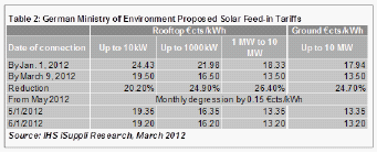 對于2012和2013年,德國政府確認的年度安裝目標是2.5-3.5GW,從2014年開始,該目標將每年下調400MW。表2所示為德國環(huán)境部所建議的FIT體系。