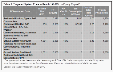 在FIT調整之后,IHS iSuppli公司的計算結果顯示,如果系統(tǒng)價格為1850歐元/kW,即使取消自我消費獎勵,德國住宅系統(tǒng)仍能達到10%的股本(20%)投資回報率。由于德國市場的價格已經降到這樣的水平,住宅領域將繼續(xù)提供有吸引力的投資條件,盡管政府降低FIT。